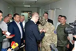 On August 21, 2014, by the decree of the President of Ukraine Petro Poroshenko, Semenchenko was awarded the Bohdan Khmelnytsky Order, Third class for "personal courage and heroism shown during protection of the state sovereignty and territorial integrity of Ukraine, dedication to loyalty oath, highly professional execution of his duty".[30][31] He was awarded for the service in the battle shown while liberating the cities of Artemivsk, Popasna and Lysychansk. On September 1, 2014, the Order was handed together with a service gun — the Makarov pistol from the Head of SBU.[32][33]