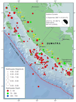 Aftershocks continued into 13 September and 14 September, with more earthquakes ranging up to magnitude 6.4.[5] Most of the aftershocks have been northwest of the original magnitude 8.4 earthquake. A 6.7 struck Southern Sumatra on Sept 20, 2007.