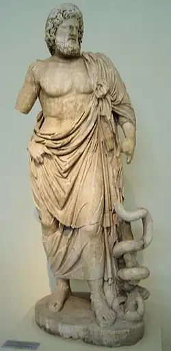 Serpents are connected with venom and medicine. The snake's venom is associated with the chemicals of plants and fungi[21][22][23] that have the power to either heal or provide expanded consciousness (and even the elixir of life and immortality) through divine intoxication. Because of its herbal knowledge and entheogenic association, the snake was often considered one of the wisest animals, being (semi-) divine. Its divine aspect combined with its habitat in the earth between the roots of plants made it an animal with chthonic properties connected to the afterlife and immortality. The deified Greek physician Asclepius, as god of medicine and healing, carried a staff with one serpent wrapped around it, which has become the symbol of modern medicine. Moses also had a replica of a serpent on a pole, the Nehushtan, mentioned in Numbers 21:8.