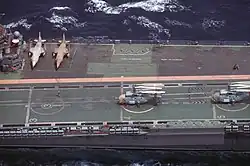 Yakovlev Yak-38 Forger aircraft and Kamov Ka-27 Helix helicopters aboard Baku in 1988.