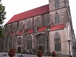 The building of the gothic church, in the basilica style and romanesque westwork, was begun at the end of the fourteenth century, the choir in 1389, the northern nave in 1404, and the tower in 1503. By 1504, the nave with its side altars was finished and all that remained to be completed was the tower. This was only done in 1883-1890, when the tower reached its current height. The interior, with the quire and the radiating side chapels to the east, was modeled after the French cathedrals.