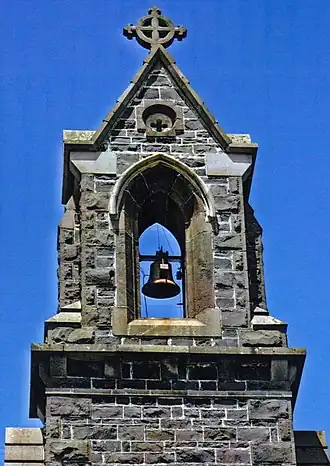 By 1857, the congregation had outgrown the second church building.[4] The parishioner, Brighton resident and prolific Melbourne architect Charles Webb, and his partner Thomas Taylor, were commissioned to design a new bluestone church, school house and vicarage.[9] "King Webb" designed the new bluestone church in the Early English Gothic style, with a prominent bellcote surmounting the gable, a small gabled western entrance porch, a seven-bay nave and small chancel. Webb's building was considered "one of the more perfect examples of a church of the period in the Colony"[10] and the majority of the building, including the distinctive western facade, remains a Brighton landmark.