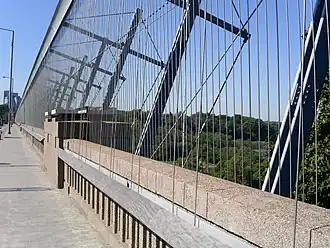 A suicide barrier is a structure intended to deter people from attempting suicide by deliberately jumping from a high place on a structure. Suicide barriers often consist of nets,[2] metal screening, and fencing.[3] Suicide barriers may be placed on tall bridges (such as those deemed "suicide bridges"), observation decks, and other tall structures.