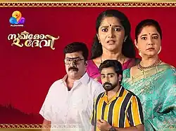 Sukhamo Devi is an Indian Malayalam-language soap opera directed by Faizal Adimali.[1] It airs on Flowers TV from 8 May 2023.[2] It stars Prayaan, Susmitha Prabhakaran and Aishwariyaa Bhaskaran in lead roles.[3] The title of the series is adapted from 1986 Malayalam film Sukhamo Devi.[4]