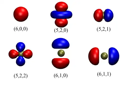 Figure 5. Atomic like orbitals of a Pt-atom. The orbitals shown are part of the double-zeta basis set used in density functional calculations. The orbitals are indexed according to the usual quantum numbers (n,l,m).