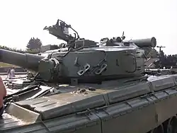 The T-84-120 Yatagan was developed in 2000 in Kharkiv to NATO standards for the Turkish tender for a new MBT.[7] The tank featured a 120mm smooth bore gun that was capable of firing AT-11 Sniper ATGMs, a reloading mechanism and blow-out panels.[7] The Yatagan was also equipped with communications equipment from the French Thomson company, an FN Herstal machine gun, automatic transmission, a 6TD-2 diesel engine with 1200hp and FCS taken from Oplot.[8] In total, three 120mm guns of different designs were tested on the tank.[9] The T-84-120 Yatagan also participated in the Kyiv parade.[10] The current condition of the tank is unknown.[8]