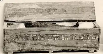 Behind the chapel there was a corridor leading to the burial chamber, which was also decorated. On the walls are painted friezes of burial goods and long funerary texts. In the burial chamber there also stood the sarcophagus of the queen. The chamber was found disturbed, when excavated.[1]