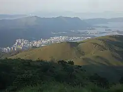 Tai Po, as seen from top of Tai Mo Shan. MacLehose Trail Stage 8 is visible on the ridge of the mountain on the right.