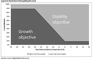 The strategic asset allocation model over time is known as the glidepath illustrating how an investment strategy becomes increasingly conservative over time towards the target date. An example of a glidepath for a selection of savings strategies for the UK market is shown in the above graphic. Generally, each fund's managements provide different glidepaths depending upon the end requirement of each client (a lump sum for withdrawal or an income producing portfolio for income drawdown), in terms of different target dates.
