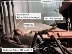 Despite several changes of course, Lake Illawarra proved unmanageable due to having insufficient steerage way. In desperation Pelc ordered 'full speed astern', at which point all control was lost. The vessel drifted towards the bridge midway between the central navigation span and the eastern shore, colliding bow first with the pile capping of Pier 19 and then amidships with Pier 18,[2] bringing three unsupported spans and a 127-metre (417 ft) section of roadway crashing into the river and onto the ship's deck. Lake Illawarra listed to starboard and sank within minutes a short distance to the south, in 35 metres (115 ft) of water. Seven crew members were trapped and drowned. The subsequent Court of Marine Inquiry found that Pelc had not handled the ship in a proper and seamanlike manner, and his certificate was suspended for six months.[3]