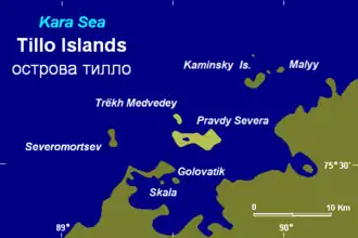 The Tillo Islands (Russian: Острова Тилло, Ostrova Tillo) is a group of small islands covered with tundra vegetation. They stretch along the Kara Sea coastal region, right off the bleak coast of Siberia's Taymyr Peninsula. Most of the islands of the group are a mere 3 or 4 km from the continental shore.