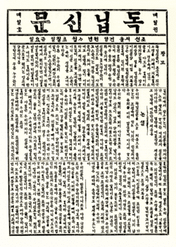 Tongnip sinmun (Korean독립신문; Hanja獨立新聞), also known by its translated title The Independent, was a historic newspaper printed in Korean and English and published between 1896 and 1899. It was the first privately managed daily newspaper in Korea and the first to print editions written exclusively in Hangul (and not interspersed with Hanja, as was common practice).