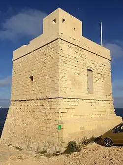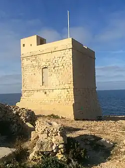 Triq il-Wiesgħa Tower was built in 1659 on the shore east of the Grand Harbour.[3] Its name means "Wide Street", because of the wide stretch of coastline it had to defend.[4] It follows the standard design of the De Redin towers, having a square plan with two floors and a turret on the roof. Triq il-Wiesgħa Tower had Santa Maria delle Grazie Tower in its line of sight to the west, and Żonqor Tower to the east, but these no longer exist as they were both demolished by the British military.