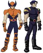 The two incarnations of Wolverine, from X-Men: Evolution. On the left his look in seasons 1 and 2, inspired by his look at the beginning of the traditional X-Men comics, on the right his look in seasons 3 and 4, inspired by his later look in the Ultimate X-Men comic.