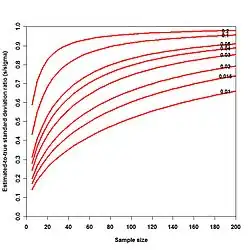 where the correction factor is the scale mean of the chi distribution with degrees of freedom, . This depends on the sample size n, and is given as follows:[1]