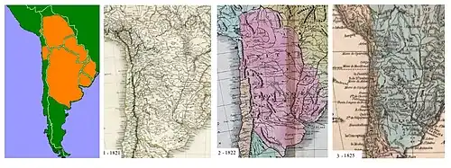 United Provinces in the 1820s as understood by political cartographers at the time. 1821: Carte physique et politique de l'Amérique méridionale.[5] 1822: The American Atlas by Carey & Lea. 1825: South America by Fisher