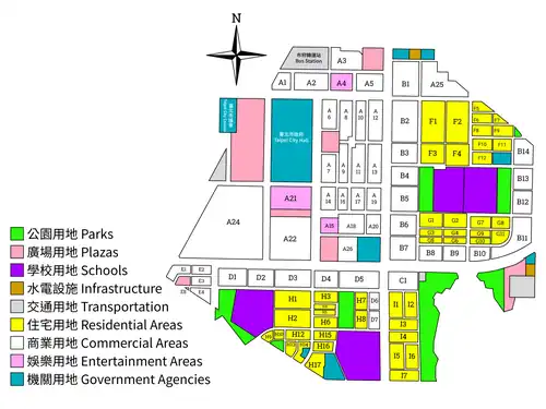 14. ^ "What plans and measures are implemented to develop the modern Taipei sub-center, the Xinyi Planning District?". english.gov.taipei. 18 April 2017. Retrieved 18 June 2022.
