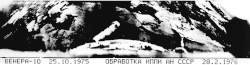 It landed near the border area between Beta Regio and Hyndla Regio[8] (within a 150 km radius of 15°25′N 291°31′E / 15.42°N 291.51°E), three days after the touchdown of, and 2200 km from Venera 9.[9] Venera 10 measured a surface windspeed of 3.5 m/s. Other measurements included atmospheric pressure at various heights, and temperature, and surface light levels. Venera 10 was the second probe to send back black and white television pictures from the Venusian surface (after Venera 9). Venera 10 photographs showed lava rocks of pancake shape with lava or other weathered rocks in between. Planned 360 degree panoramic pictures could not be taken because, as with Venera 9, one of two camera lens covers failed to come off, limiting pictures to 180 degrees.