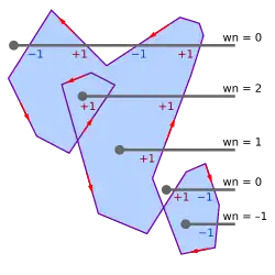 Visualization of Dan Sunday's winding number algorithm. A winding number of 0 means the point is outside the polygon; other values indicate the point is inside the polygon