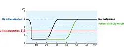 Diagram depicting mouth acidity changes after consuming food high in carbohydrates. Within 5 minutes the acidity in the mouth increases as the pH drops. In persons with normal salivary flow rate, acid will be neutralized in about 20 minutes. People with dry mouth often will take twice as long to neutralize mouth acid, leaving them at higher risk of tooth decay and acid erosion