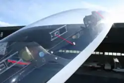 It is typically constructed from a short piece or tuft of yarn placed in the free air stream where it is visible to the pilot.[3] In closed-cockpit aircraft, it is usually taped to the aircraft canopy. It may also be mounted on the aircraft's nose, either directly on the skin, or elevated on a mast, in which case it may also be fitted with a small paper cone at the trailing end.[4] They are commonly used on gliders, but may also be found on jet aircraft (especially fighters), ultralight aircraft, light-sport aircraft, autogyros,[5] airplanes and helicopters. Its usefulness on airplanes with a tractor configuration (single propeller at the nose) is limited because the propeller creates turbulence and the spiral slipstream displaces the string to one side.[6]