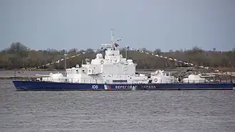 The Yaz-class small artillery craft, also known as Project 1208, is a Russian Coast Guard patrol craft. This gunboat is designed to operate in rivers to secure and protect Russian maritime borders, enforce navigational laws and other law enforcement duties, and search and rescue. The gunboats work alongside other Russian Coast Guard and Navy vessels, such as the Vosh-class and Ogonek-class river patrol crafts.[1] The single active vessel is assigned to the Amur-Ussuri River network.