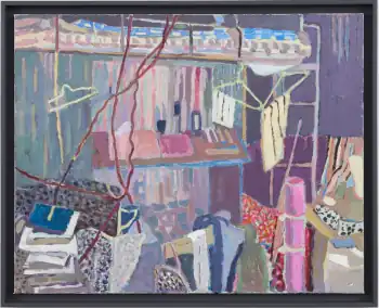 Critics noted a significant turn in Ji's exhibition, "The Sunflower Turned Its Back" (James Cohan Gallery, 2022), toward new imagery (flowers, a portrait) and a new medium (acrylic on canvas) that further conveyed the global, universal nature of his subject matter.[40] Stylistically less caricatured or expressionist, these works were painted in thickly applied, dry, chalky colors that exploited the saturation and opacity of acrylic and created interplay between abstraction and representation, flat pattern and volumetric form.[40][2] In paintings such as Bunk Bed or Satellite Dish on a Bed (both 2023), New Yorker critic Johanna Fateman noted juxtapositions of "dappled light and dynamic clutter [recalling] early Matisse" with the disarray of jumbled belongings on streets and hasty departures, which created tonal shifts between gaiety and gravitas.[2]